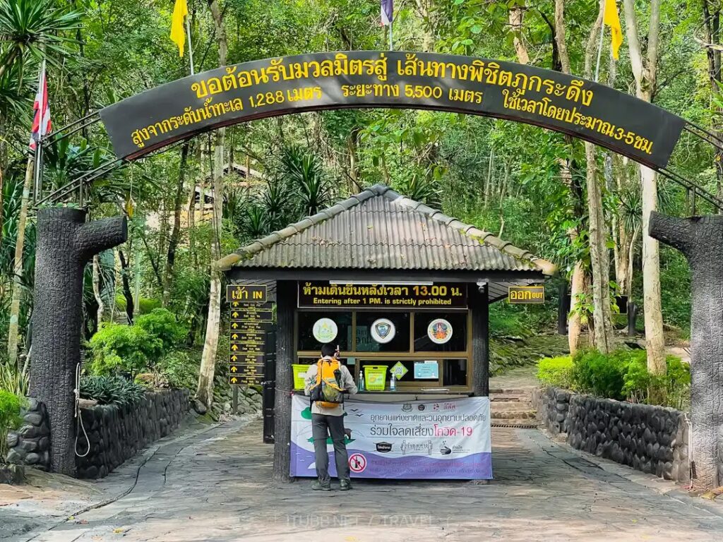 ที่ตรงทางเข้าของจุดเริ่มเดินเราจะต้องตรวจตั๋วและฉีกหางบัตรที่เราได้ทำการชำระค่าเข้าอุทยานมาคร้าบ ตรงจุดนี้มีป้ายเขียนเอาไว้ว่า ระยะทางเดินขึ้น 5,500 เมตร ใช้เวลาเดินโดยประมาณ 3-5 ชั่วโมง และห้ามเดินขึ้นหลังเวลา 13.00 ย้ำ! ห้ามเดินขึ้นภูกระดึงหลังบ่ายโมง เพราะจะมืดและอันตรายมากครับ